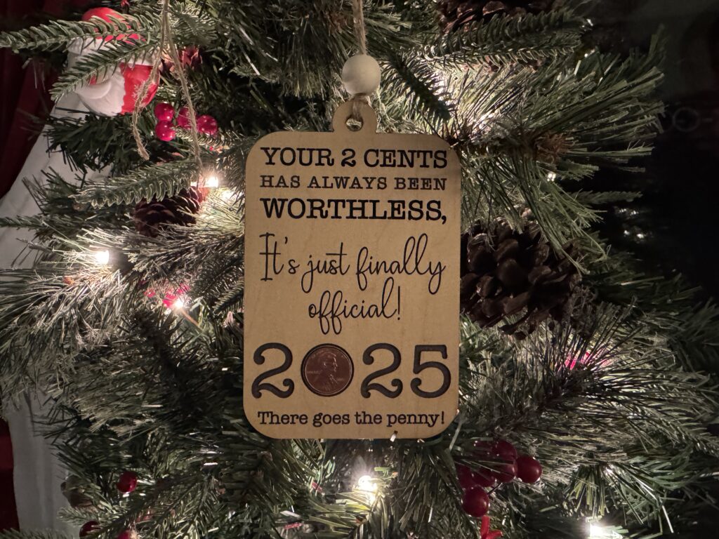 “Your 2 cents has always been worthless — it’s just finally official!” Laser-engraved wood ornament commemorating the last year of the US penny. Add your own 2025 U.S. penny.